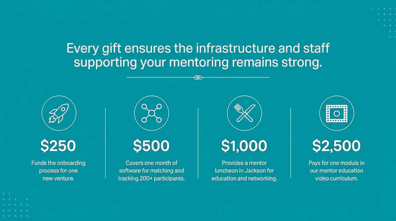 Thank you for helping us drive impact for entrepreneurship in the Tetons and beyond.Every gift strengthens the ecosystem for founders, mentors, and changemakers. $10.00 $20.00 $30.00 $40.00 Custom Amount Please enter an amount $ One-Time Donation Weekly Donation Monthly Donation Quarterly Donation Annual Donation Support us by covering the fees we have to pay 3% Cover the Fee DOnate to general fund DOnate to general fund TEAMS 2026 Mentor Giving Campaign $250.00 funds the onboarding process for one new venture $500.00 covers one month of software that enables matching, communications and program tracking for over 200 past and present participants $1,000.00 provides a valuable mentor luncheon in Jackson for education and networking $2,500.00 pays for one module in our mentor education video curriculum, training mentors for years to come Custom Amount Please enter an amount $ One-Time Donation Weekly Donation Monthly Donation Quarterly Donation Annual Donation Support us by covering the fees we have to pay 3% Cover the Fee Donate to teams campaign Donate to teams campaign